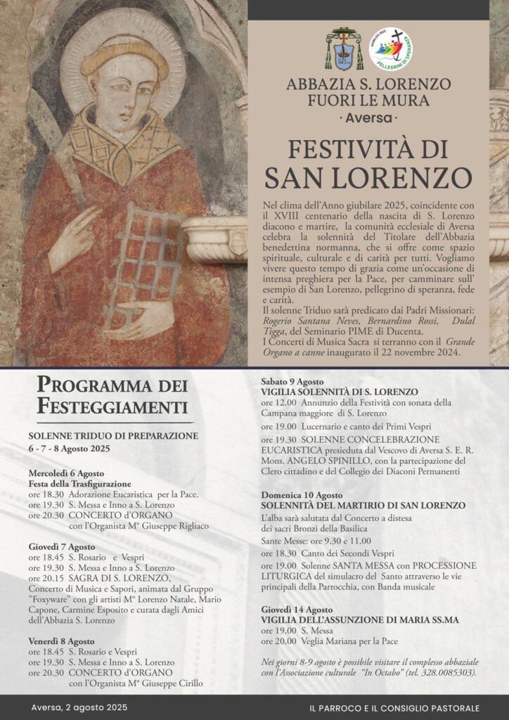 Nel clima dell’Anno Santo, che cade quest’anno nel XVIII centenario della nascita di San Lorenzo, a partire da mercoledì 6 agosto la comunità ecclesiale di Aversa celebra la festa giubilare del Titolare dell’Abbazia benedettina normanna, un tempio che si offre come spazio spirituale, culturale e di carità per tutti.