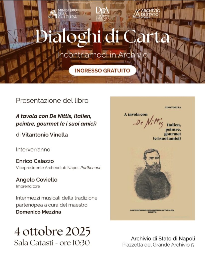 Il 4 ottobre 2025 alle ore 10.30, nella sala Catasti dell’Archivio di Stato di Napoli (piazzetta Grande Archivio, 5), verrà presentato al pubblico partenopeo “A tavola con De Nittis Italien, peintre, gourmet (e i suoi amici)”. Il libro porta la firma di un altro barlettano d’eccellenza, il giornalista e scrittore Nino Vinella.