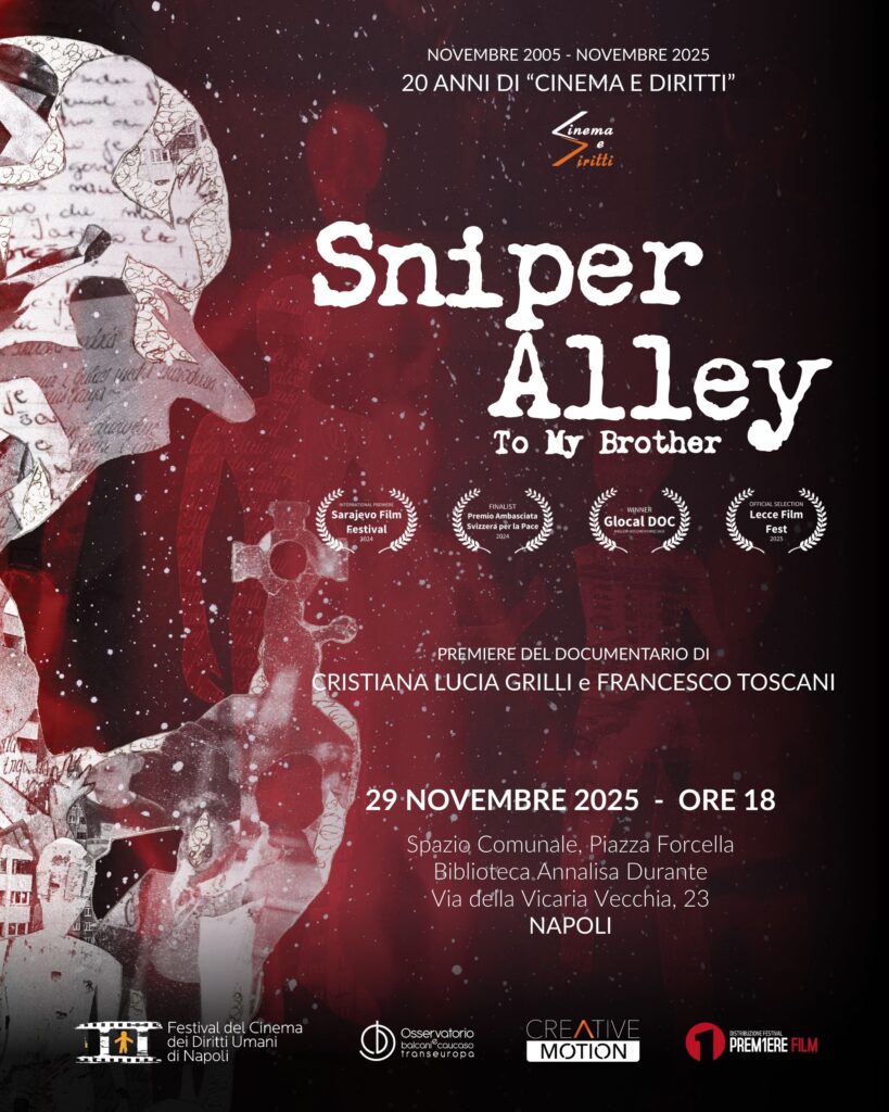 NAPOLI – “Per la forza con cui intreccia memoria personale e storia collettiva, restituendo allo spettatore uno sguardo vivo e necessario su ciò che la guerra lascia e ciò che la memoria può ancora salvare. Attraverso la ricerca di un fratello perduto, il film costruisce un linguaggio universale che parla di lutto, umanità e rinascita”. Con questa motivazione il docufilm ‘Sniper Alley – To My Brother’ si è aggiudicato il premio principale come miglior documentario al Glocal DOC 2025 di Varese. Un riconoscimento prestigioso per il lavoro incentrato sulla storia di Džemil Hodžić e sul suo progetto “Sniper Alley Photo” (che ha l’obiettivo di ricostruire la memoria dell’assedio di Sarajevo attraverso le immagini dei più grandi fotoreporter di guerra) nato dopo la tragica perdita del fratello Amel, ucciso da un cecchino a soli 16 anni. Il docufilm – realizzato dallo studio di produzione con sede a Pescara Creative Motion che da anni porta avanti progetti di impegno civile e culturale a livello internazionale – continua a essere proiettato in contesti autorevoli. Dopo la presentazione nell’aula magna dell’Università di Anversa seguirà la Prima Nazionale italiana, con la proiezione in occasione del XVII Festival del Cinema dei Diritti Umani di Napoli alla presenza di numerosi ospiti.