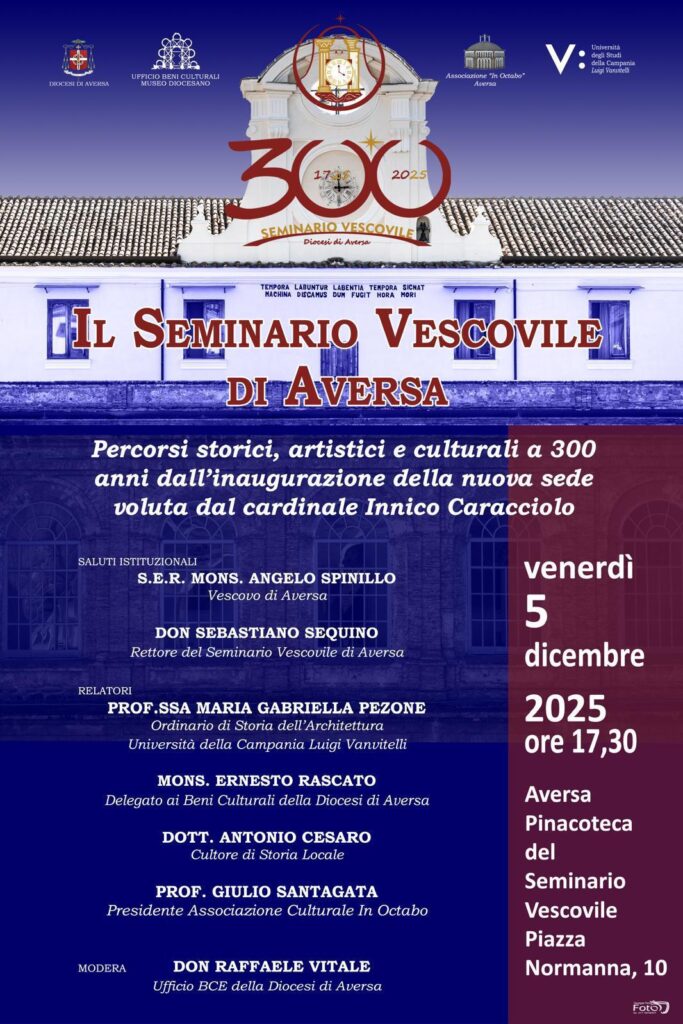 In occasione del tricentenario dall’inaugurazione della nuova sede del Seminario Vescovile di Aversa, è in programma per venerdì 5 dicembre 2025, alle ore 17:30, nella Pinacoteca del Seminario Vescovile, il convegno storico-culturale dal titolo: “Il Seminario Vescovile di Aversa: Percorsi storici, artistici, culturali a 300 anni dall’inaugurazione della nuova sede voluta dal Cardinale Innico Caracciolo” promosso dalla Diocesi di Aversa in collaborazione con l’Associazione turistico culturale In Octabo. L’evento intende ripercorrere le tappe fondamentali di un’istituzione che ha segnato profondamente la vita religiosa, educativa e sociale del territorio. Studiosi ed esperti offriranno uno sguardo rinnovato sulle sue origini, sulla sua evoluzione e sull’eredità che ancora oggi continua a trasmettere, in un momento di riflessione condivisa per celebrare un patrimonio di memoria e di comunità.